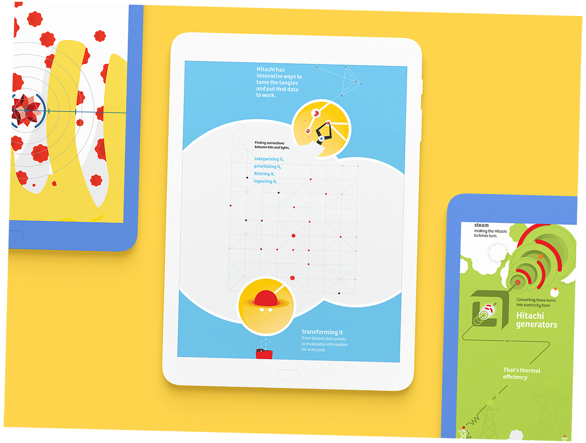 I have a knack for turning complex subject matter into easily relatable situations and stories. For Hitachi, an electronics and software company, not only was I able to make their impressive technology easy to digest, but also dramatize the simplicity of what they do with scroll based illustrative stories.